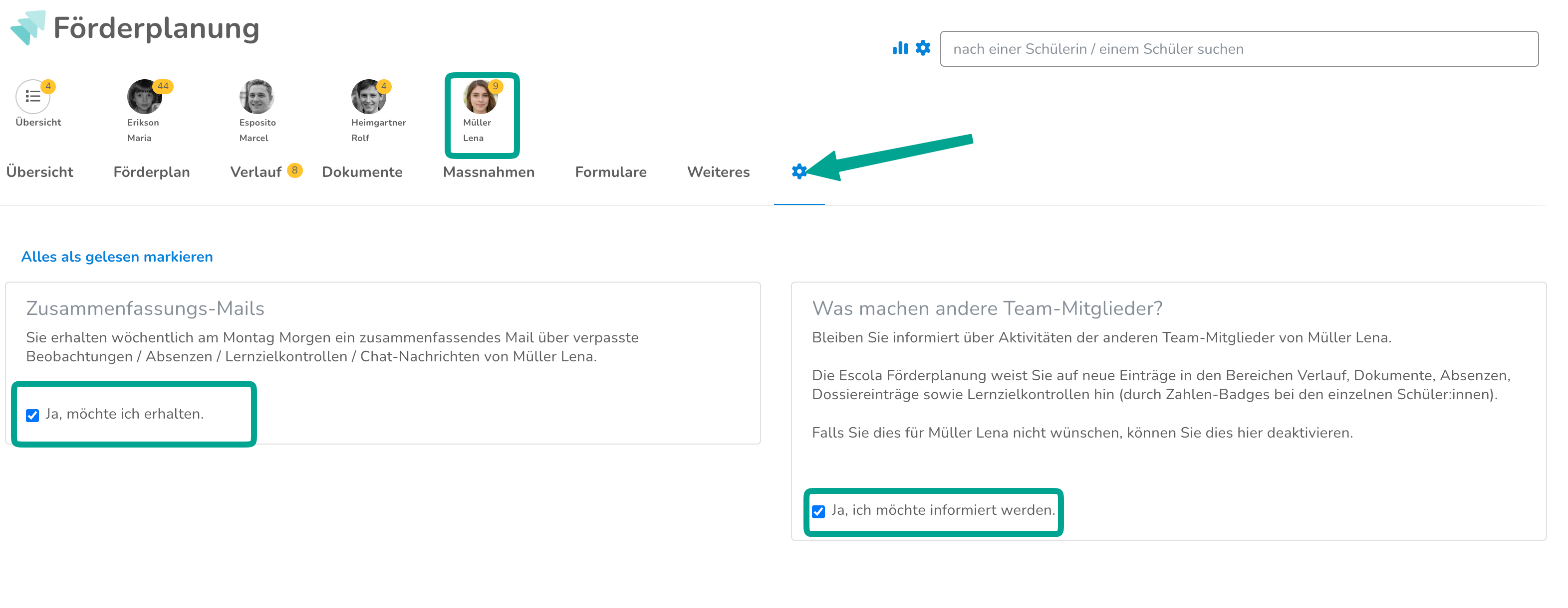Falls die globale Einstellung für die Benachrichtigungs-E-Mails aktiviert ist (siehe oben), kann pro Schüler:in eingestellt werden, ob du E-Mail-Benachrichtigungen erhalten möchtest oder nicht.