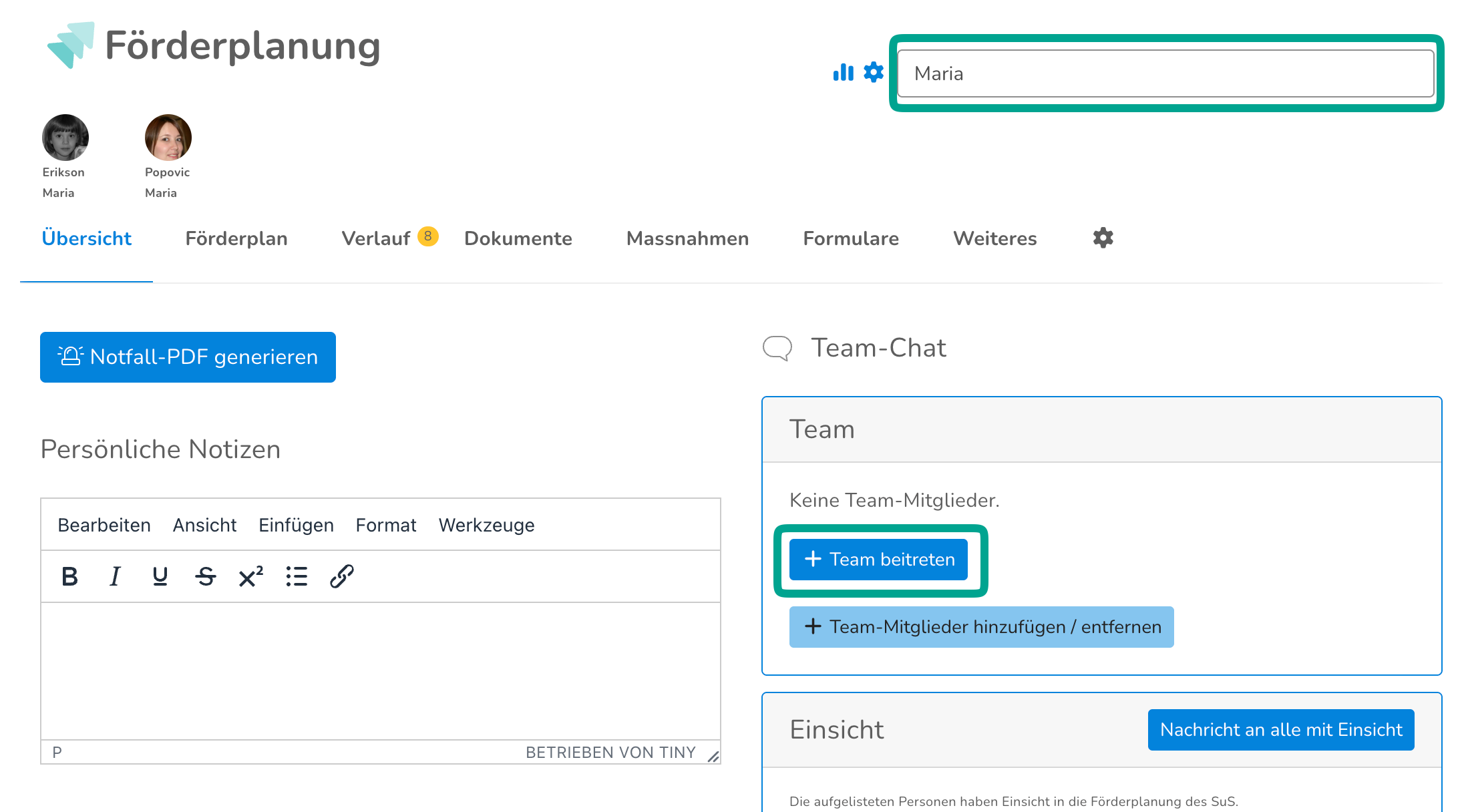Dann bist du noch bei keiner Schülerin und keinem Schüler im Team der Förderplanung. Du kannst über das Suchfeld (1) nach einer Schülerin oder einem Schüler suchen und dort dem Team beitreten.