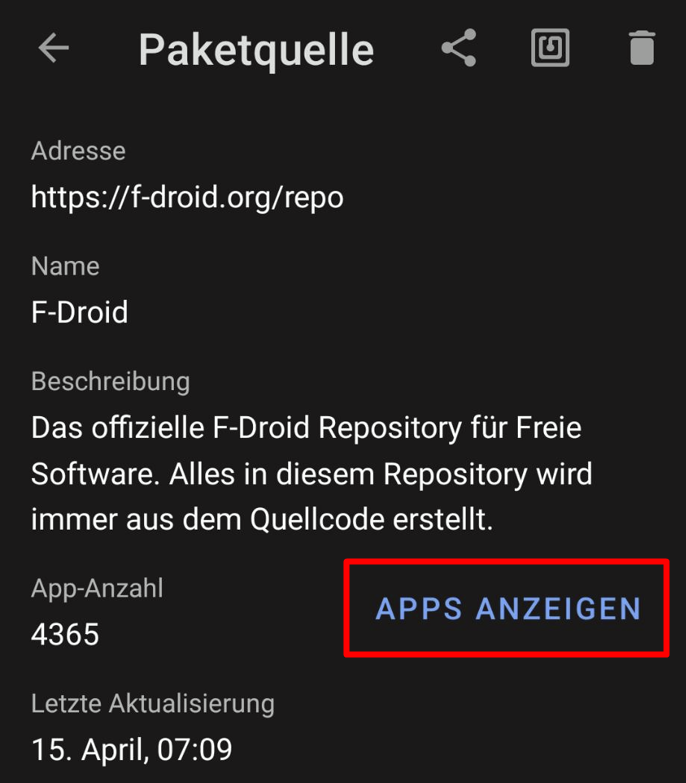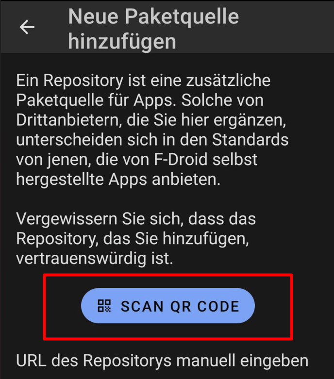 Gehe in der F-Droid-App zu Einstellungen > Paketquellen und tippe auf das +, um eine neue Paketquelle hinzuzufügen.