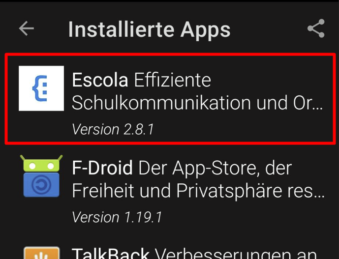 In den Einstellungen erscheint bei "Installierte Apps verwalten" nun die Escola App. Du kannst sie direkt von dort öffnen, indem du sie anklickst.