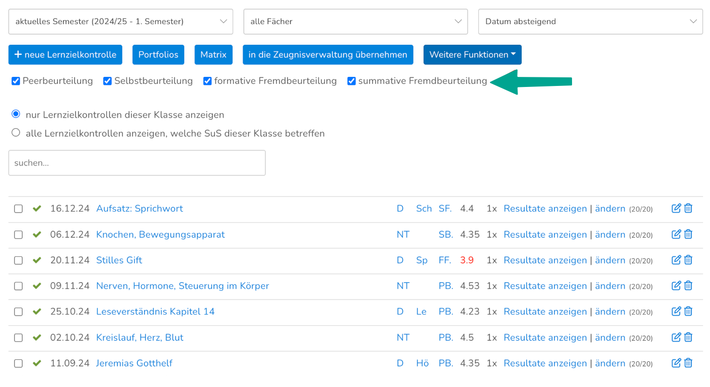 Beim Erfassen einer Lernzielkontrolle kann der Beurteilungsgegenstand erfasst werden: