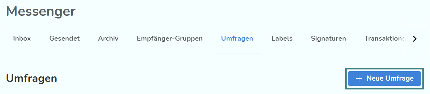 Um eine Umfrage zu erstellen, gehe im Messenger auf den Reiter "Umfrage". Klicke dann auf "Neue Umfrage".