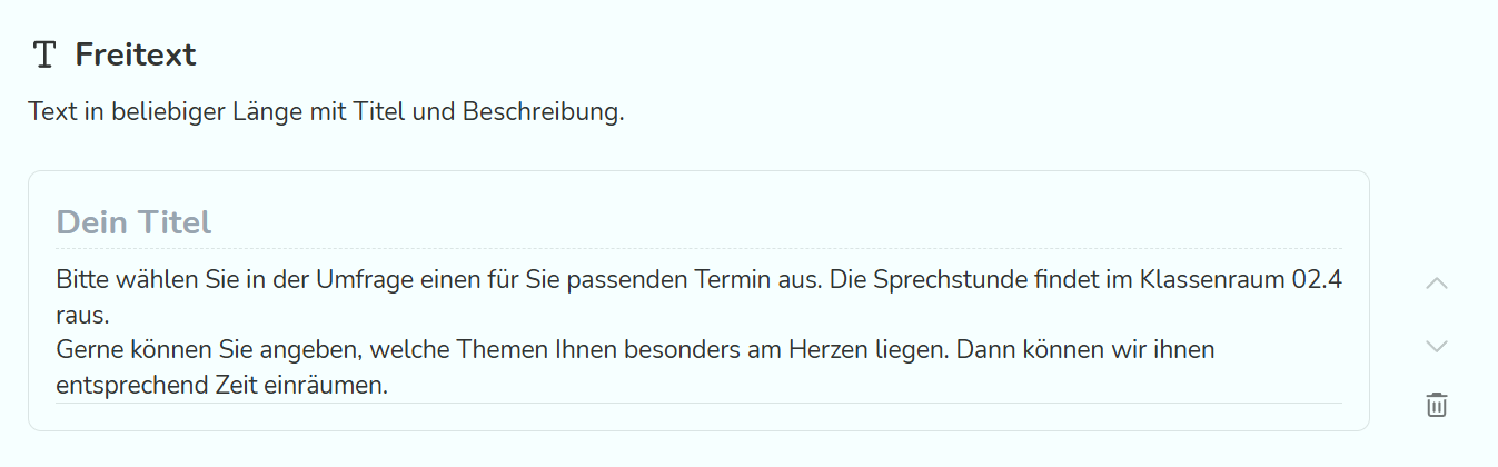 Über Freitext kann Text in die Umfrage eingebaut werden, die von den Empfänger:innen lediglich gelesen werden soll.