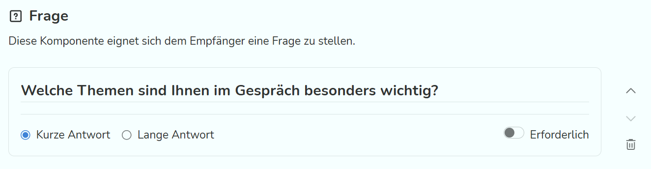Mit dem Baustein "Frage" kann eine Frage formuliert werden, die von den Empfänger:innen mit einem freien Text beantwortet werden kann. Wenn die Antworten maximal 200 Zeichen betragen soll, steht die Option "kurze Antwort" zur Verfügung. Bei diesem Baustein kann festgelegt werden, ob er in der Umfrage als Pflichtfeld ("Erforderlich") angezeigt werden soll oder nicht.