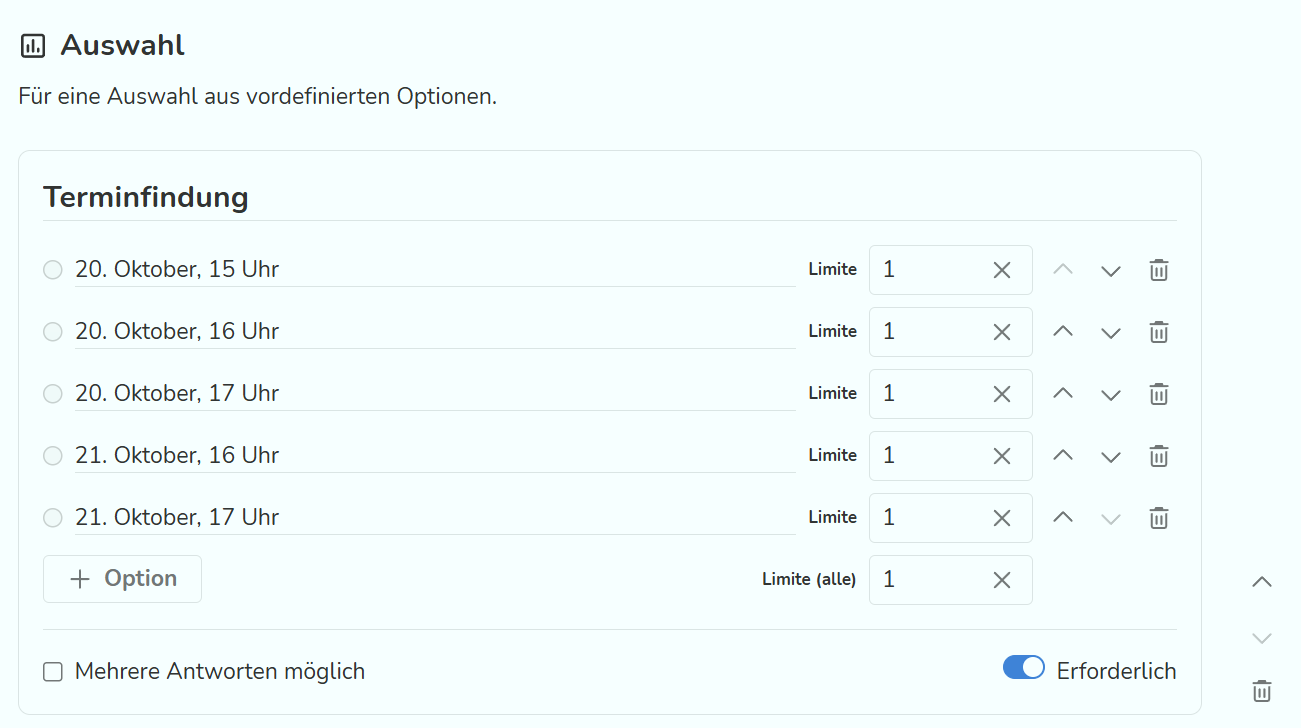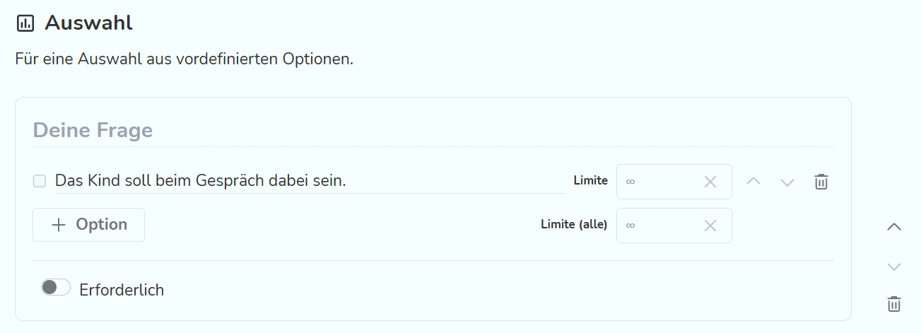 Beim Baustein "Auswahl" kann eine Frage gestellt werden, bei der Antwortmöglichkeiten vorgegeben werden. Hier kann definiert werden, ob auch mehrere Antworten gleichzeitig angekreuzt werden können. Über "Limite" kann definiert werden, wie viele der beantwortenden Personen dieselbe Antwort geben dürfen. Wenn die Limite erreicht ist, steht diese Antwort den anderen Empfänger:innen nicht mehr zur Verfügung. Bei diesem Baustein kann festgelegt werden, ob er in der Umfrage als Pflichtfeld ("Erforderlich") angezeigt werden soll oder nicht.