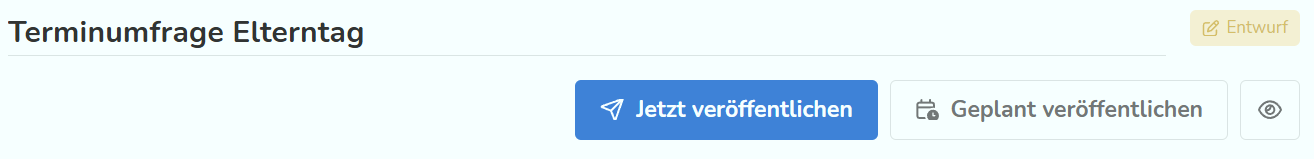 Über das Augensymbol kannst du dir eine Vorschau der Umfrage anschauen. Zum Veröffentlichen hast du zwei Möglichkeiten. Entweder klickst du auf "Jetzt veröffentlichen", dann steht die Umfrage ab sofort zu Verfügung. Beachte dabei, dass sie erst ausgefüllt werden kann, wenn du sie an die Personen, die sie ausfüllen sollen, versandt hast.