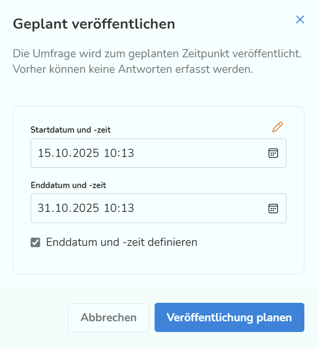 Oder du klickst auf "Geplant veröffentlichen" , wenn du einen genauen Zeitraum definieren willst, in dem die Umfrage zum Ausfüllen verfügbar sein soll. Dann kannst du einen Start- und einen Endzeitpunkt festlegen.