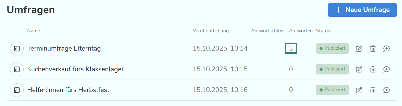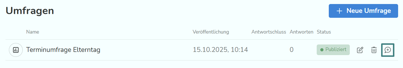 Wenn du die Umfrage direkt versenden möchtest, gehe zurück auf die Übersicht. Hier siehst du die erstellte Umfrage, kannst sie nochmal bearbeiten, löschen oder direkt versenden. Für Letzteres klicke auf die Sprechblase ganz recht.