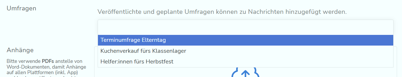 Um die Umfrage der Nachricht anzuhängen, kannst du unten in der Nachricht unter Umfragen über das Drop-Down-Menü die entsprechende Umfrage auswählen.
