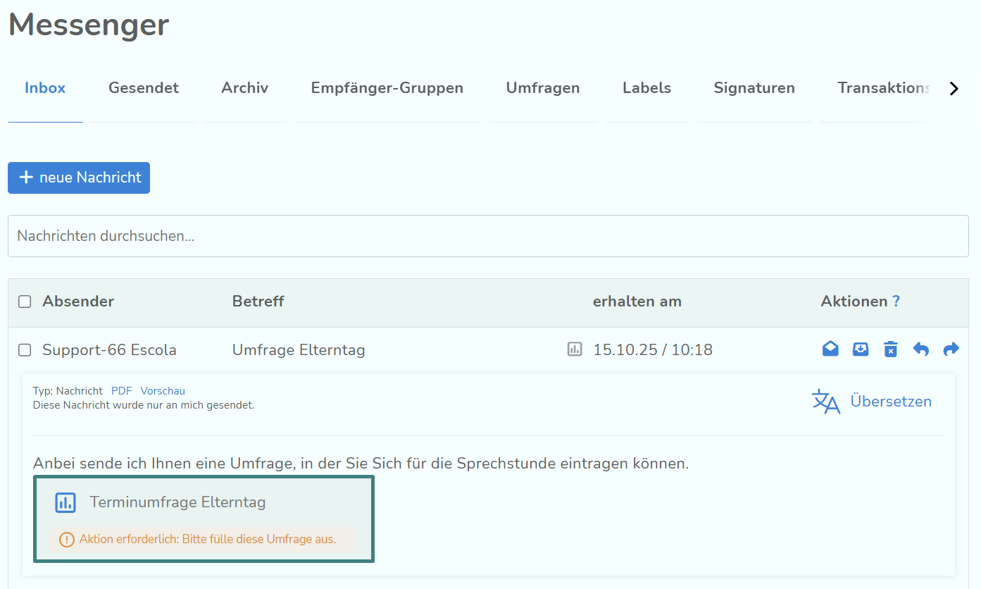 Der Messenger von Escola bietet die Funktion, Umfragen zu erstellen. Dabei können Umfragen mit Auswahl- und Freitextfeldern individuell erstellt und über den Messenger versendet werden. Die Empfänger:innen wie beispielsweise Bezugspersonen können die Umfragen im Messenger ausfüllen. Die Antworten werden der Ersteller:in im Messenger angezeigt.