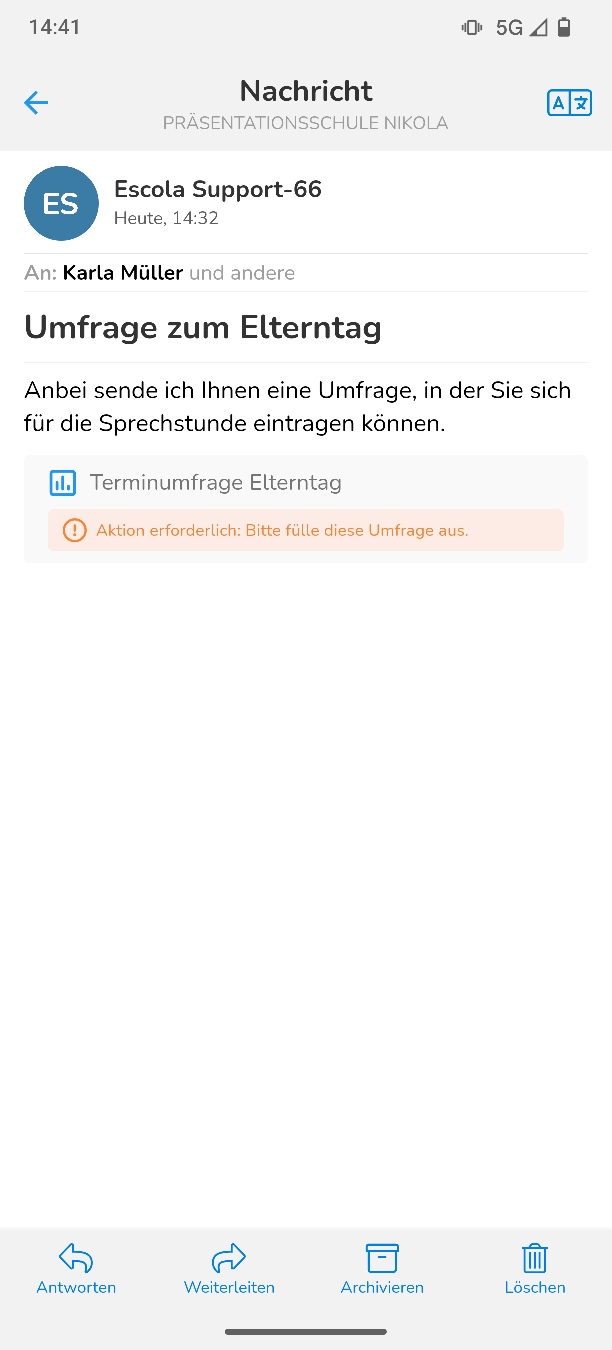 Wichtig: Umfragen, die auf Escola erstellt wurden, können nur über den Escola-Messenger und nicht über E-Mail verschickt werden. Sie können darum nur mit Personen geteilt werden, die auf Escola erfasst sind. Jede Umfrage kann pro Person nur einmal ausgefüllt werden! Wenn eine Familie mehrere Kinder hat, kann pro Elternteil trotzdem nur eine Umfrage ausgefüllt werden.