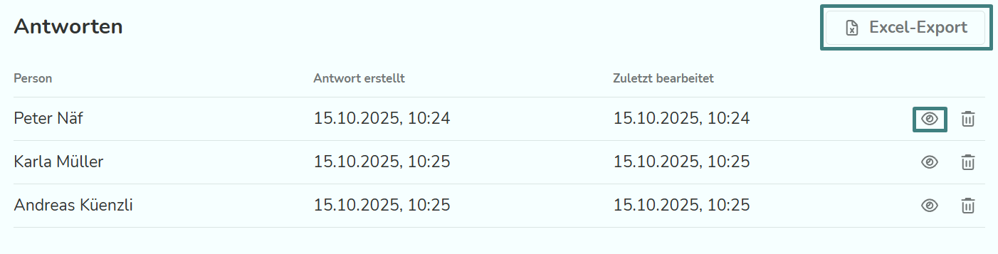 Wenn du auf die entsprechende Umfrage klickst, kannst du sehen, welche Personen bereits geantwortet haben und kannst dir über das Augensymbol ihre Antworten anzeigen lassen. Hier besteht auch die Möglichkeit, sich die Ergebnisse im Excel-Format zu exportieren.