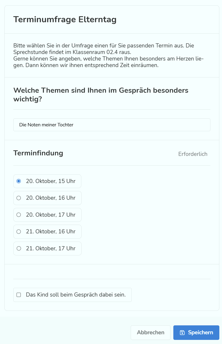 Wenn du die Umfrage ausgefüllt hast, klicke auf Speichern, um deine Antworten einzureichen.
